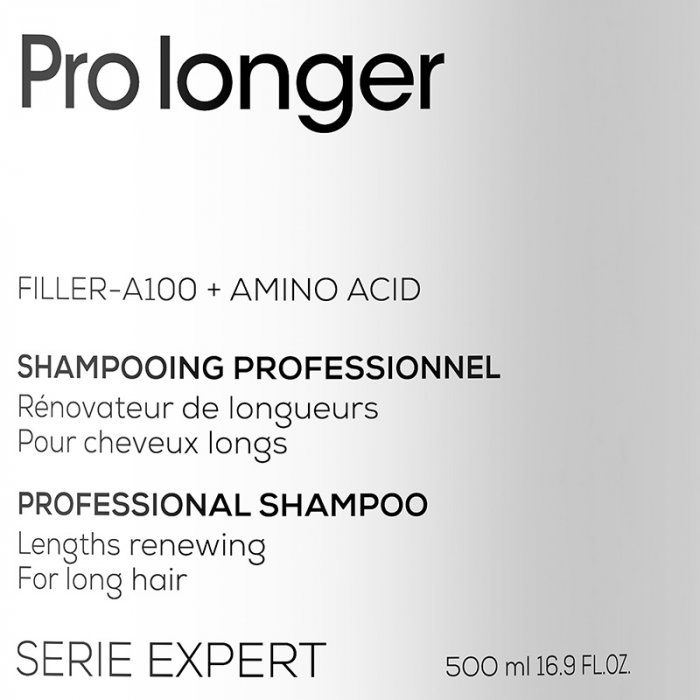 El shampoo Pro Longer ayuda a engrosar el cabello largo mientras lo hace visiblemente más saludable y de aspecto más fuerte. Cuando se usa con el acondicionador Pro Longer para cabello largo, hay una reducción del 44% del quiebre del cabello y las puntas abiertas se reducen visiblemente en un 20%*. La tecnología Filler A-100 utilizada está patentada por L'Oréal Professionnel y actúa penetrando el núcleo de la fibra para dar volumen y engrosar el cabello desde el interior. Los aminoácidos en la fórmula trabajan para fortalecer el cabello desde el exterior. La fórmula funciona en las puntas delgadas o en las áreas donde más se necesita ayuda. *Prueba instrumental: shampoo + acondicionador